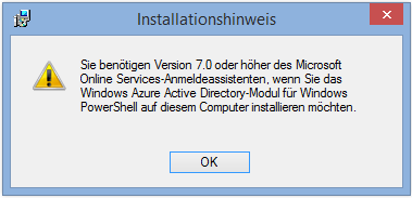 Das Office365 Powershell-Modul (Office365=Windows Azure) lässt sich nicht installieren. Sie erhalten die Fehlermldung: “Sie benötigen VErsion 7.0 oder höher des Microsoft Online Services Anmeldeassistenten, wenn Sie das Windows Azure Active Directory-Modul für Windows PowerShell auf diesem Computer installieren möchten”.